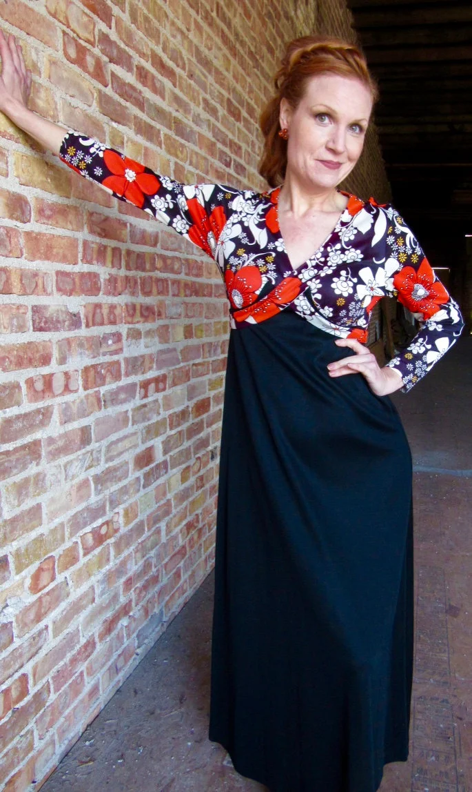 The bold Flower detailing and V neckline make this dress priceless. Perfect for work, holiday parties and costumes.
