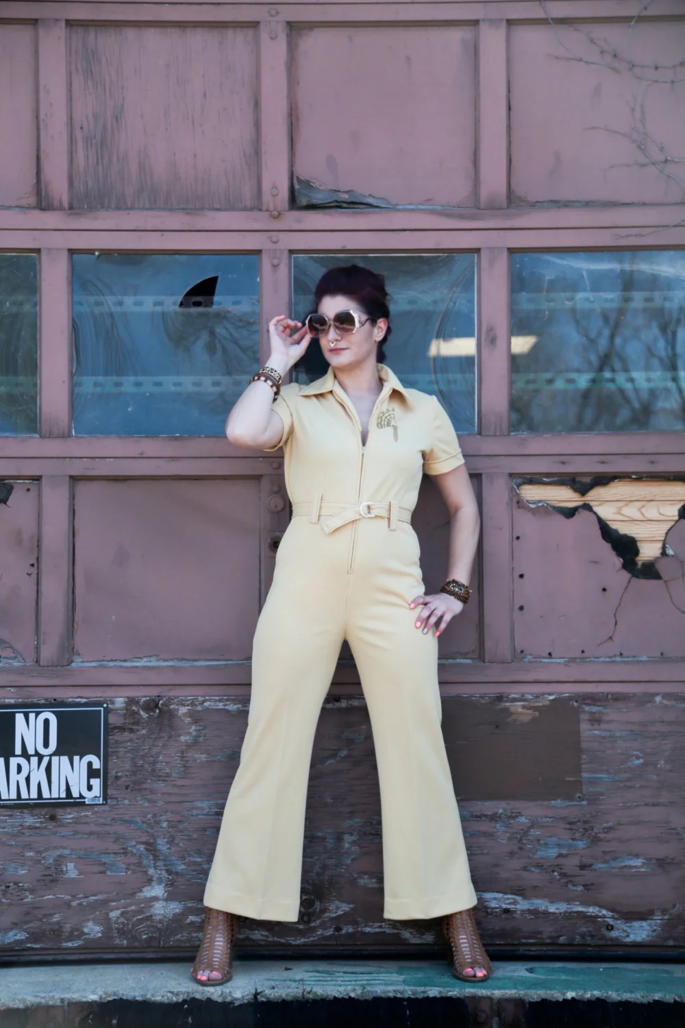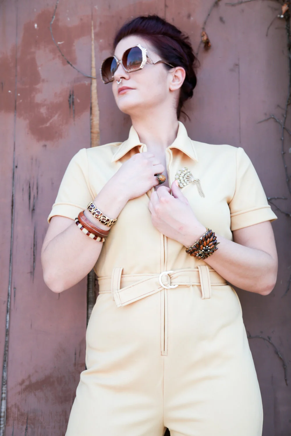 Chic Tan Jumpsuit with belt and striking deep V zipper and collar. Perfect for everyday wear or as costume.