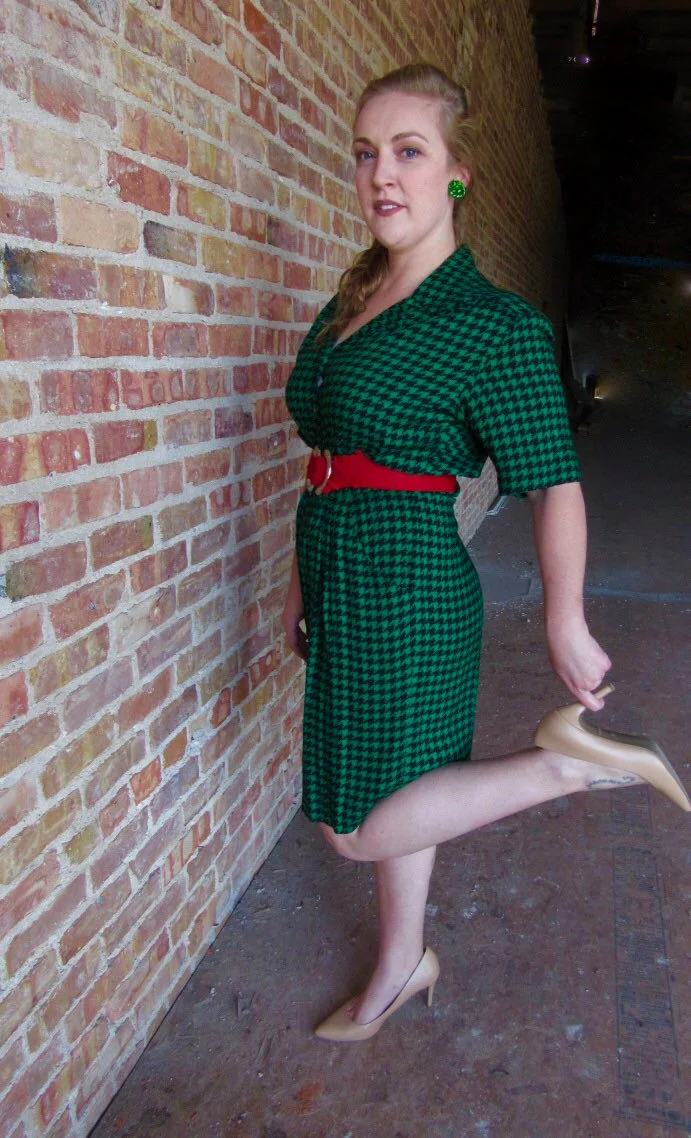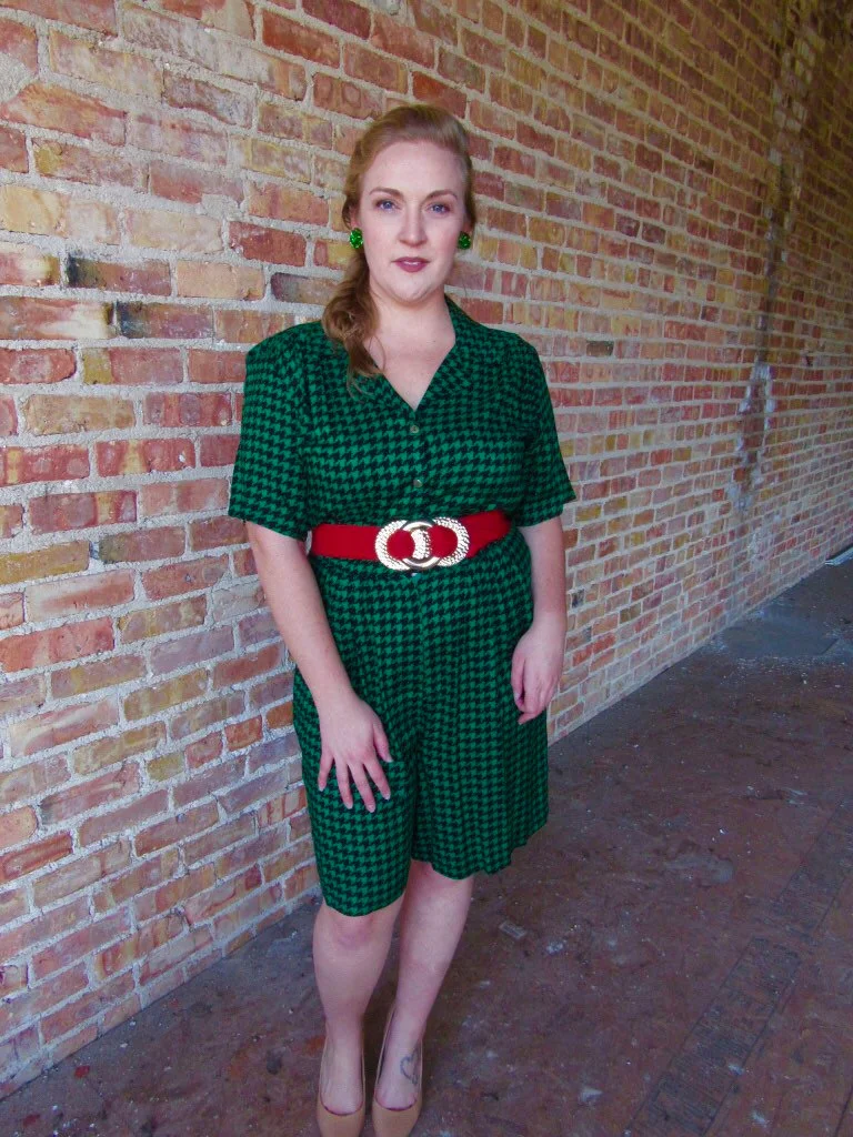 Green and Black Retro Romper with shoulder pads; which can be easily removed. - Red Belt not included but is available, if not sold.