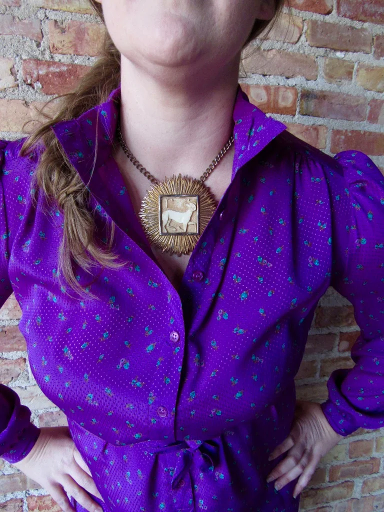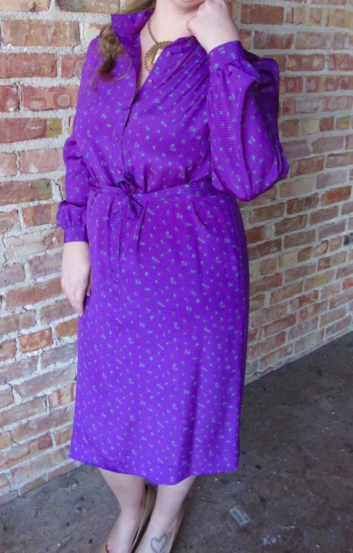 Beautiful Purple dress with teal flower detailing. Button closures and Tie belt make this dress perfect for both work and Play. Fabric is soft and light.