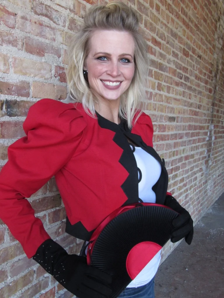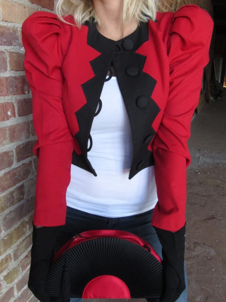 Red Dress coat with Puff Shoulders, oversized buttons and wonderful triangle detailing. Pair with our Red and Black Fan purse to a priceless holiday outfit.
