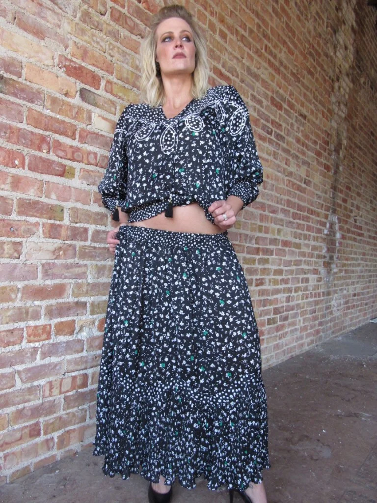 Two piece black and white dress with embroidery detailing. Skirt has elastic waist with pleating on the lower portion of the skirt.