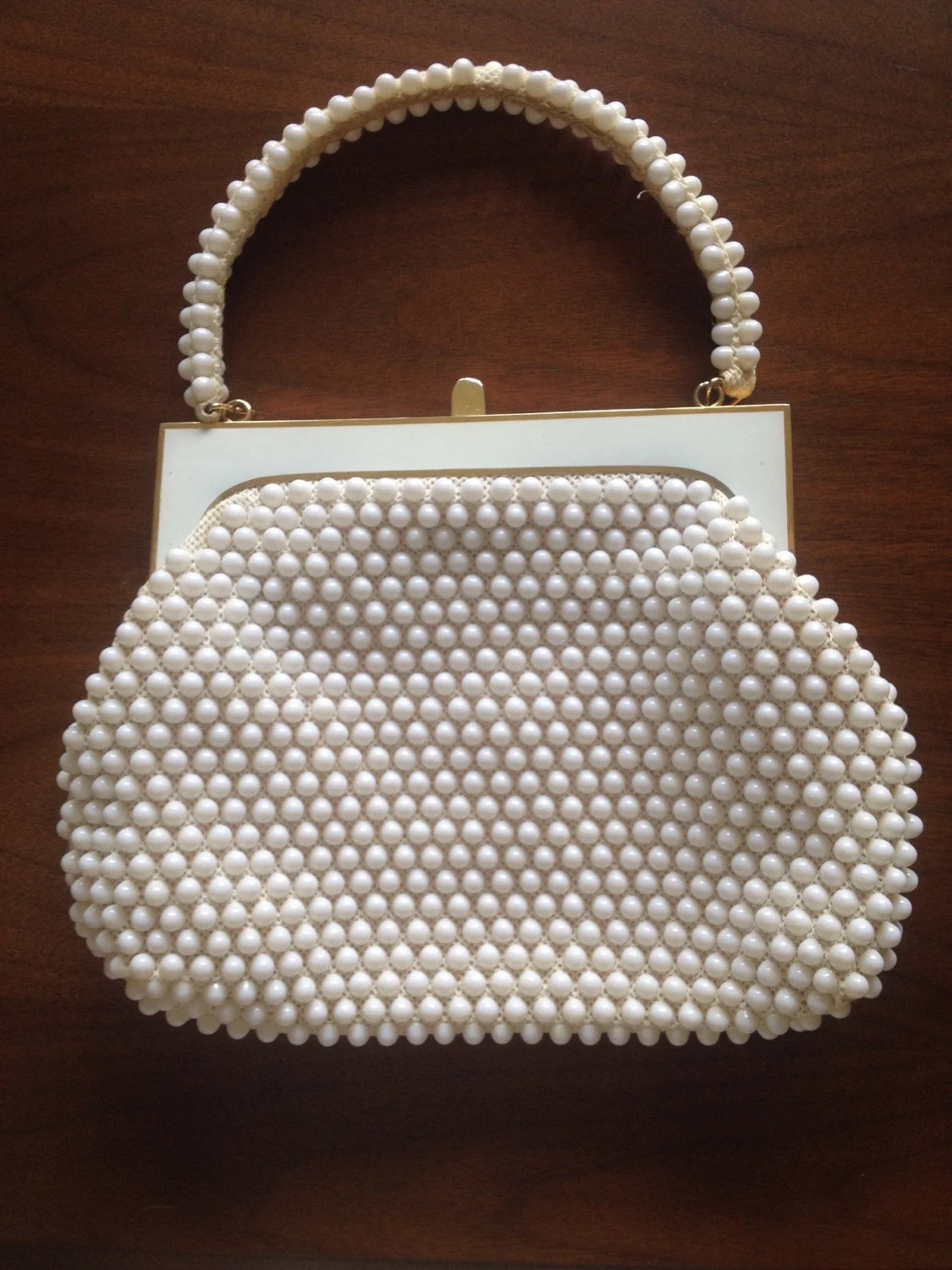 Vintage petite beaded hand bag with white and gold clasp. Looks great with a dress and heels or dressed down with s tshirt, sweater and jeans.